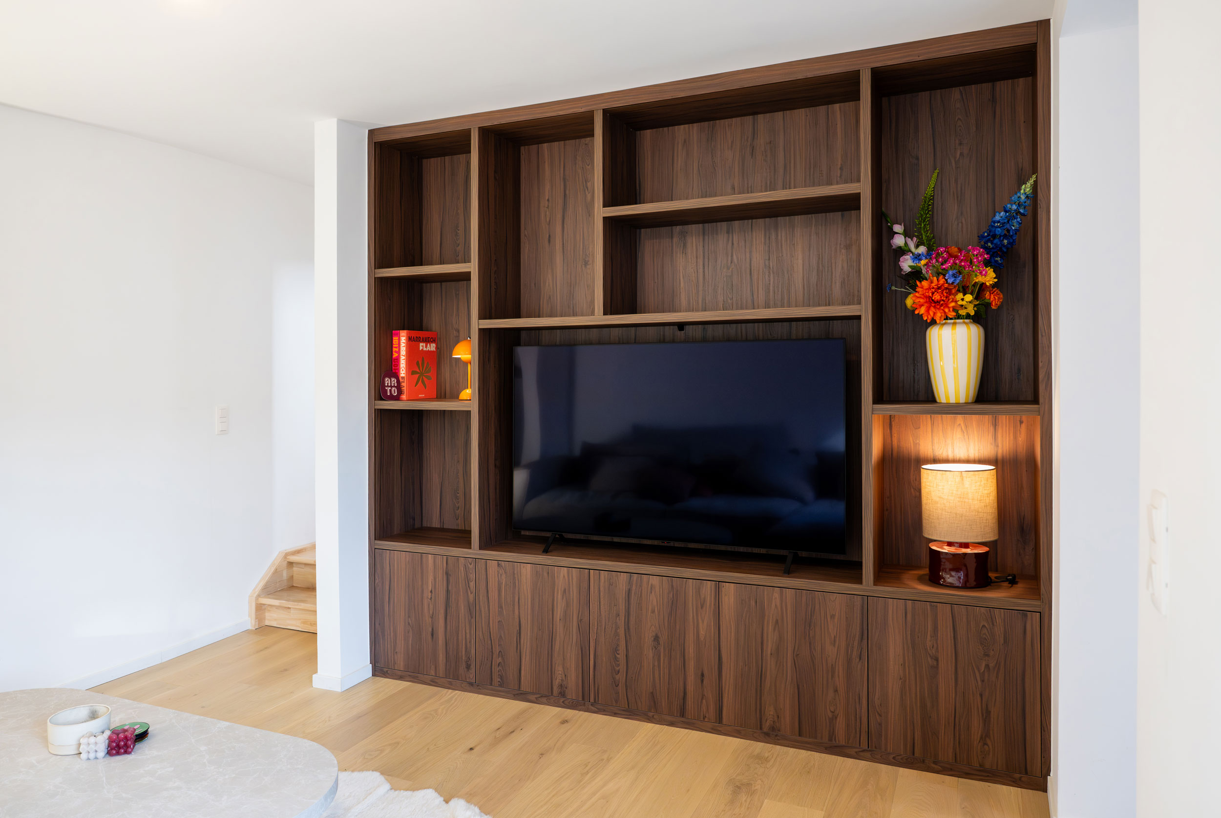 Op maat gemaakt tv-meubel uitgevoerd in walnoot.